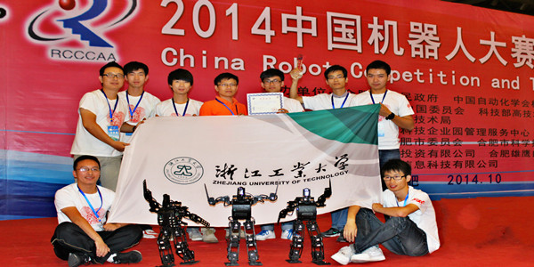 2014中国机器人大赛暨RoboCup中国公开赛于 类人组机器人竞赛共有RoboCup足球机器人比赛(类人组Kid-Size)、RoboCup足球机器人挑战赛(类人组Kid-Size)两项大型比赛,也是历届大赛中竞争最为激烈、技术难度最大、参赛院校最多的赛事之一,其中涉及图像采集、图像识别、自主定位、远程通信和机械设计等众多技术难题。在RoboCup足球机器人比赛中,在RoboCup足球机器人比赛中,我院队伍先后战胜来自清华大学、华中科技大学等知名高校的队伍,最终获得该组别亚军,并晋级世界总决赛。 中国机器人大赛暨RoboCup公开赛是中国最具影响力、最权威的机器人技术大赛,是中国机器人尖端技术产业竞赛和人才汇集交流的重要活动之一。大赛自1999年至今已成功举办了十四届。本届大赛共吸引了清华大学、上海交通大学等200所高校,近3000名学生参赛。比赛共设类人组机器人竞赛、服务机器人比赛、舞蹈机器人比赛等12个大项、118个子项。 我院机器人队伍于2013年成立,由王万良教授和姚信威博士指导,致力于机器人技术研究。目前由来自计算机学院、信息学院、国际学院等多个学院的本科生和研究生组成。我院已连续两年组队参赛中国机器人大赛并均获得全国一等奖,已成为国内大学生机器人竞赛强队之一。