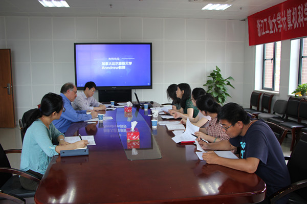 5月25日,加拿大达尔豪斯大学计算机学院院长Andrew Rau-Chaplin教授来我院参观访问,学院党委书记范菁、副院长沈国江、副院长江颉等热情接待了Andrew教授。 会上,范菁书记首先对Andrew教授的来访表示热烈欢迎,并简单介绍了我院的基本情况,以及与加拿大达尔豪斯大学的国际合作培养项目的开展情况。接着,双方就两校科研合作领域及合作方式、国际合作培养项目协议的修订等展开了深入的讨论。 会后,Andrew教授参观了学院硬件实验室、物联网实验室、网络实验室及浙江省重点实验室智能交通平台等。