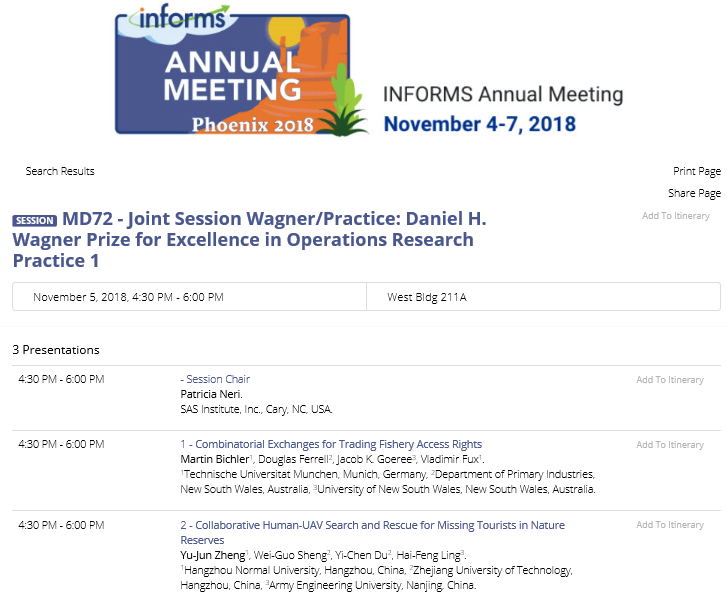 Search & Rescue for Missing Tourists in Nature Reserves”获得协会颁发的瓦格纳运筹学最佳实践奖(Daniel H. Wagner Prize