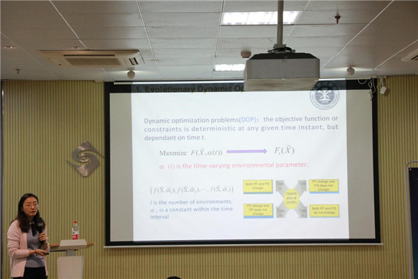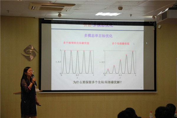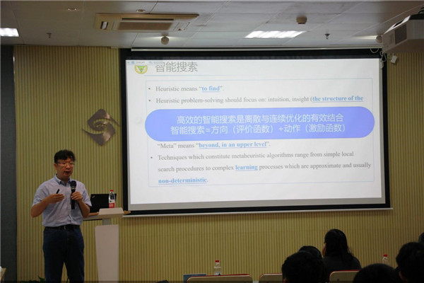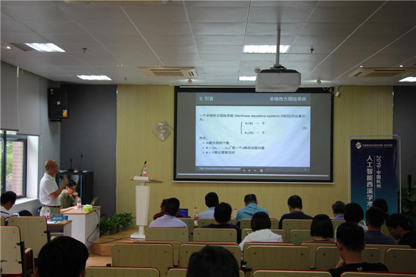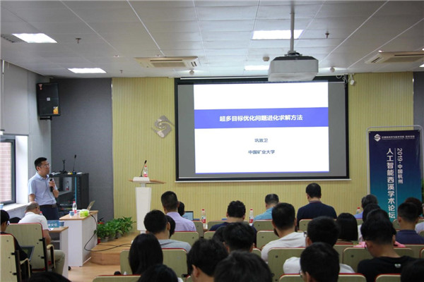 论坛现场 在为期两天的会议中,国家杰出青年基金获得者、清华大学长聘教授王凌教授,华东理工大学、控制理论与控制工程国家重点学科带头人顾幸生教授,教育部新世纪优秀人才、中国矿业大学巩敦卫教授,国家杰出青年基金获得者、华中科技大学高亮教授,英国朴茨茅斯大学刘洪海教授,美国南卡罗来纳大学唐继军教授,教育部新世纪优秀人才、东南大学首席教授李小平教授,郑州大学梁静教授,全国百篇优秀博士论文获得者、国防科技大学邢立宁研究员,中国矿业大学郭一楠教授,中国地质大学龚文引教授等11 位专家,就人工智能理论及其在不同领域的应用及科教融合、产教融合,分别做了“数据驱动的智能工程优化调度”、“不确定间歇生产过程智能调度技术”、“超多目标优化问题进化求解方法”、“优化技术在CAD/CAE 中的应用”、“人体运动行为感知与理解及其体验式在线教学应用”、“深度学习在三维基因组学的应用”,“服务系统的调度优化”,“多模态多目标优化研究概况”、“面向任务规划的人工智能技术”、“动态鲁棒进化优化方法”、“基于进化算法的非线性方程组多根求解”等大会报告。